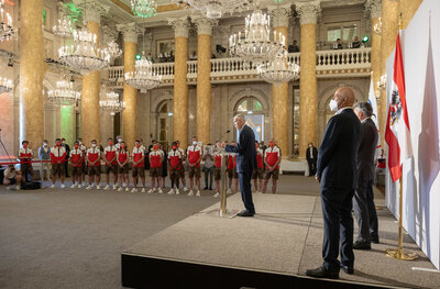 Bundespräsident Alexander Van der Bellen wünschte dem Team alles Gute und hob auch die Vorbildwirkung des Teams hervor: „Ich freue mich, sie alle persönlich verabschieden zu dürfen. Nach eineinhalb Jahren Covid19 ist es ja auch nicht selbstverständlich, dass das jetzt möglich ist. Sie haben mit ihren Leistungen bewiesen, dass sie zu den Schnellsten, stärksten, Besten und Präzisesten ihrer Disziplinen gehören. Ich kann mir vorstellen, welch langen Weg jeder Einzelne und jede Einzelne bis hierher zurückgelegt hat. Sie haben Stärke, Ausdauer, Disziplin und Durchhaltevermögen gezeigt und Teamgeist und für mich ein ungeheures Ausmaß an Energie und Zielstrebigkeit. Dafür bewundern wir sie. Ich wünsche ihnen Allen faire und verletzungsfreie Spiel und natürlich viel Erfolg. Alles Gute in Tokio und vor allem, kommen sie gesund wieder zurück.“