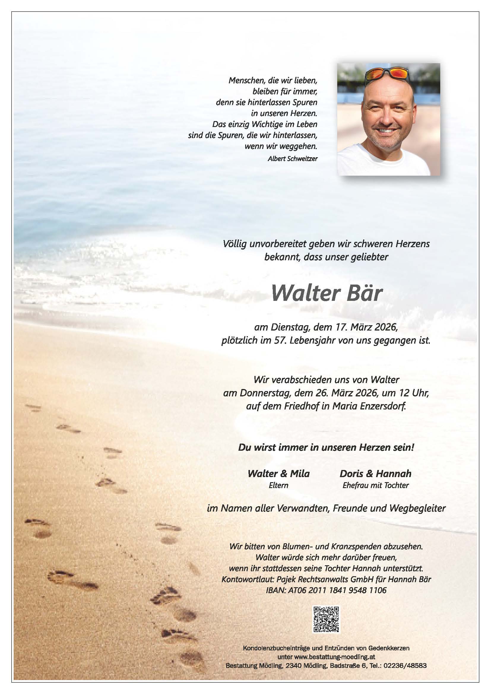Walter würde sich mehr darüber freuen, wenn die Trauergemeinde stattdessen seine Tochter Hannah für ihren weiteren Ausbildungsweg unterstützt.